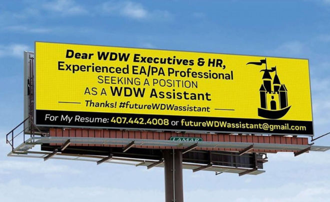 그리곤 이렇게 적었다. “친애하는 월드 디즈니 월드(WDW) 임원 및 HR 담당자님, 경험 많은 EA/PA 전문가가 월트 디즈니 월드에서 보조 일을 찾고 있습니다.” 하단에는 그의 전화번호와 이메일주소가 적혀 있다. “WDWassistant@gmail.com”